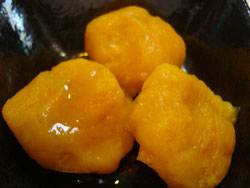 カボチャに小麦粉を加えて茹でたものに、ハチミツをかけたものです。白玉団子よりも柔らかく作っています。カボチャは使い勝手の良い食材の一つで、おかずにもお菓子にもなるので便利です。