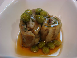 茄子の中に豚肉と大葉を巻き、しょう油あんをかけたものです。茄子は薄く切ってレンジで加熱しましたが、硬さが残ってしまいました。中に大葉を巻いてあるので、良い香りがします。