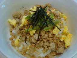 ごはんは味付けしていないので、そぼろが少し濃く味付けしてあります。鶏そぼろの上に、卵、いんげん、のり、でんぶわ飾りました。彩りもよくできました。