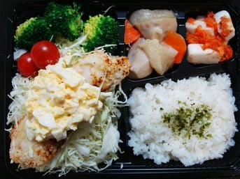 さてダイエット弁当は、たらのノンフライのタルタルソース添えとキャベツ、ブロッコリー、トマト、里芋の煮物、はんぺんの人参和えです。