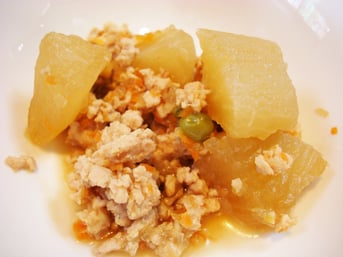まだまだ旬の大根を使ってそぼろあんかけを作りました。大根は、じっくりとだしで煮込んで薄く味をつけてあります。
