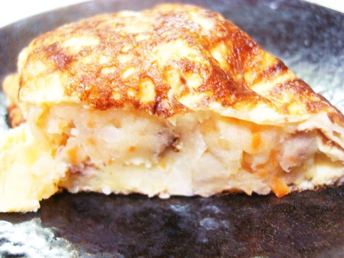 スパニッシュオムレツは卵の中にじゃが芋、ピーマン、玉ねぎ、人参などの野菜を入れて、フライパンで焼いた物です