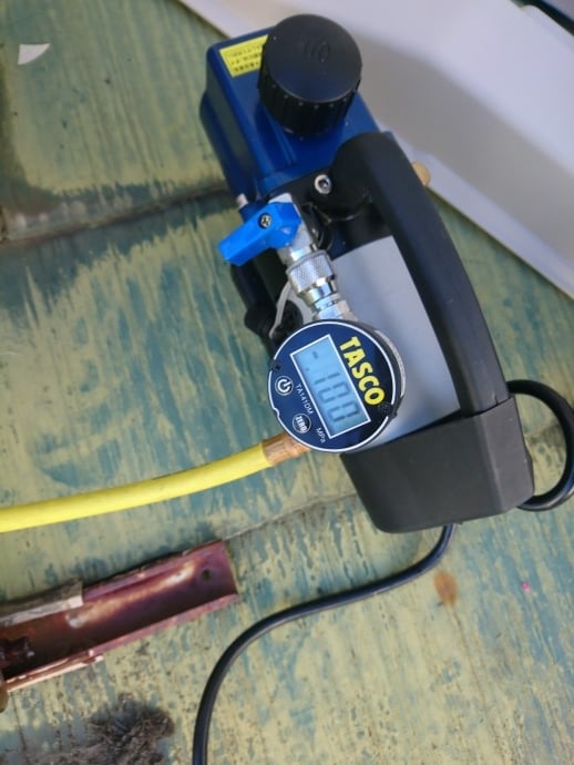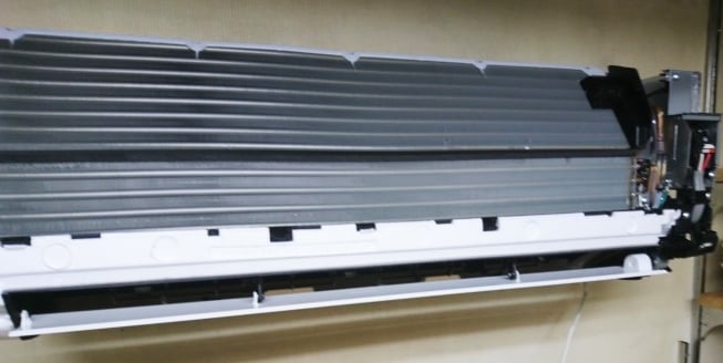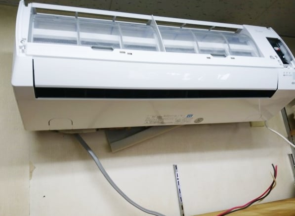 背板に室内機を引っかけて、掛つなぎで配管類を接続。