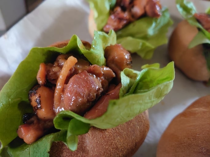 甘辛たれがお肉に絡んで、さらにそのたれが染み込んだパンが