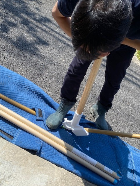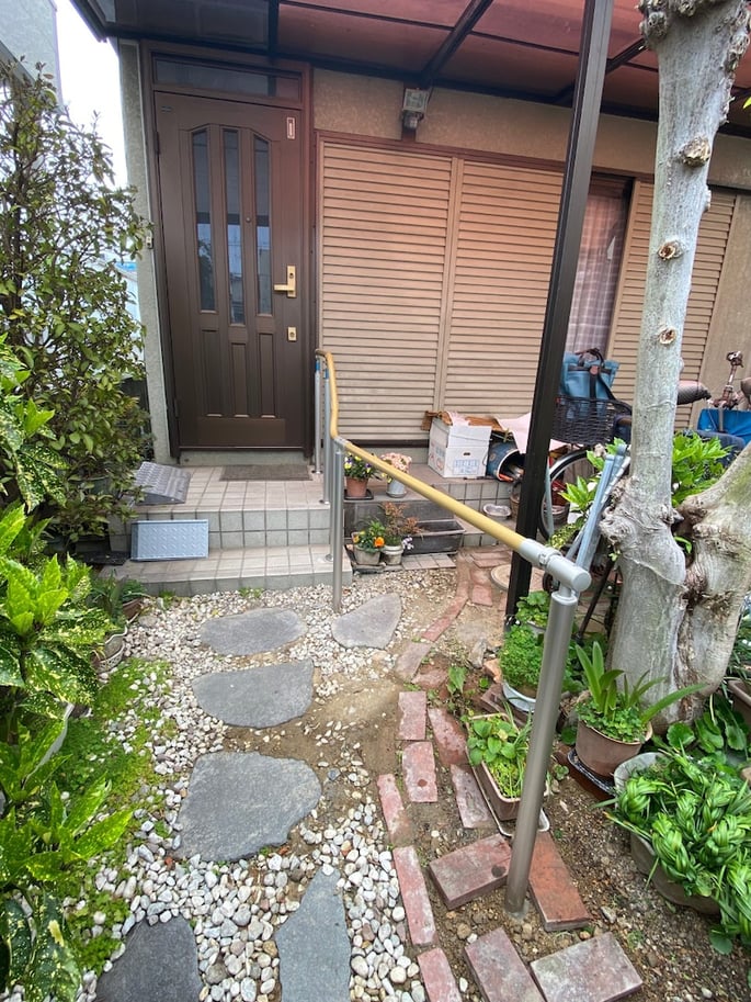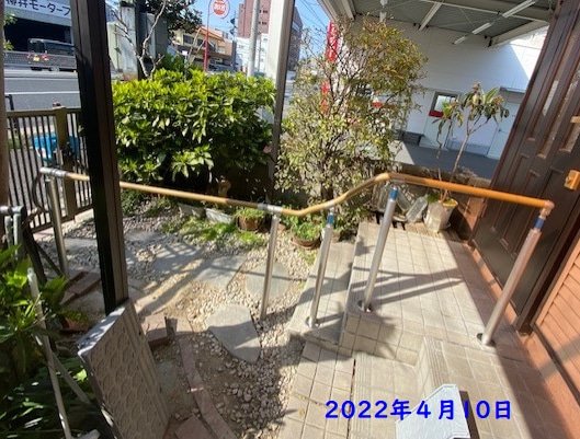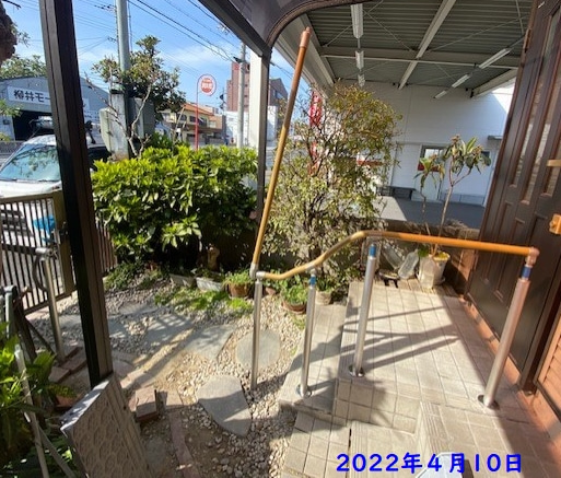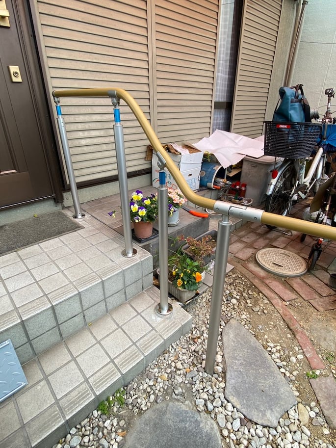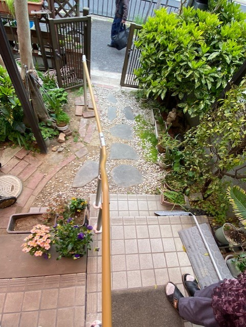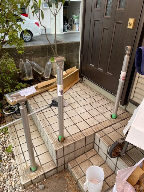 自由に曲げられる手すりと屋外遮断機式手すりの取り付け。介護保険住宅改修費利用出来ます。